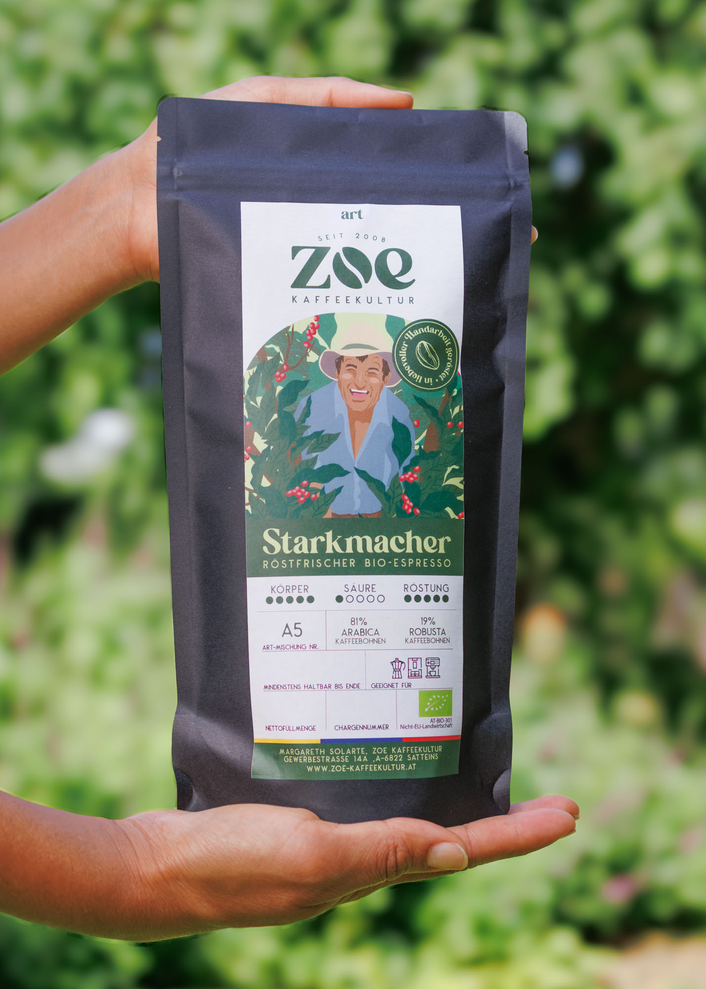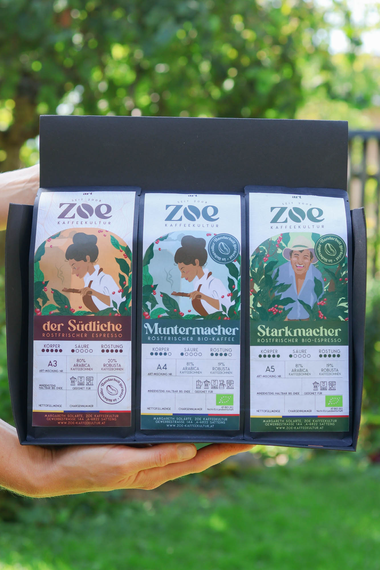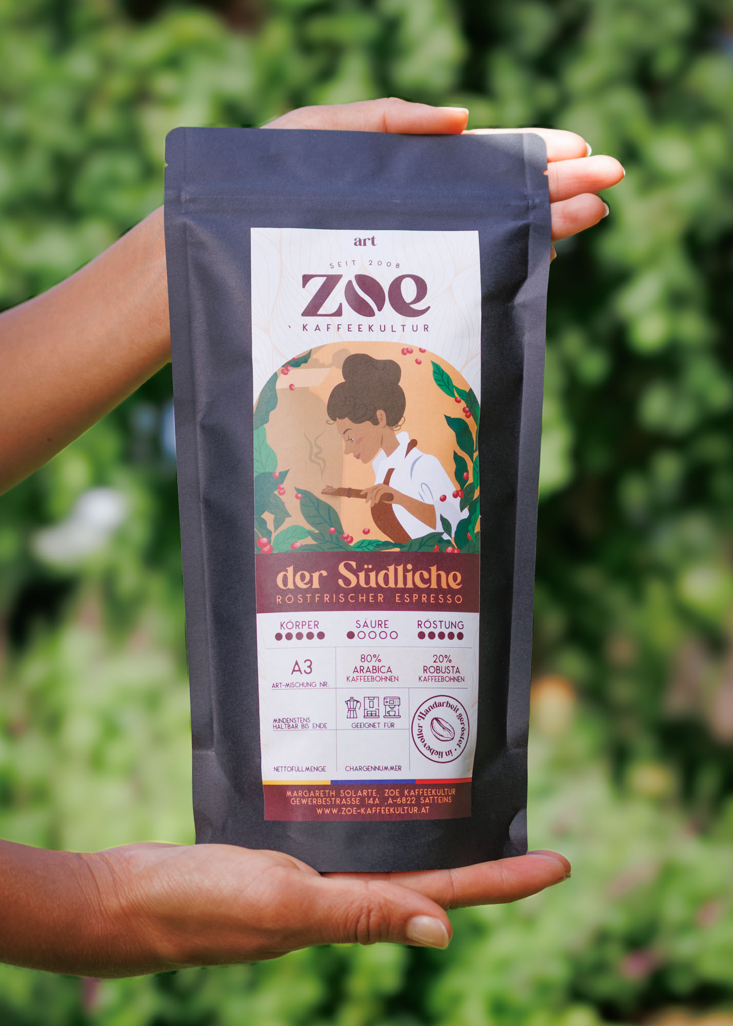 ZOE art sind Mischungen aus sortenreinen Kaffees, eine Liaison aus Handwerk, Zeitgeist und Genuss. Die Kreationen werden einzeln mit röstfrischen Kaffees nach dem Röstvorgang gemischt und mit den Sinnen kreiert. So kann jede Kaffeesorte ihre individuellen Eigenschaften, die sich während dem Röstvorgang entwickeln, in das Gesamtkunstwerk einfließen lassen.